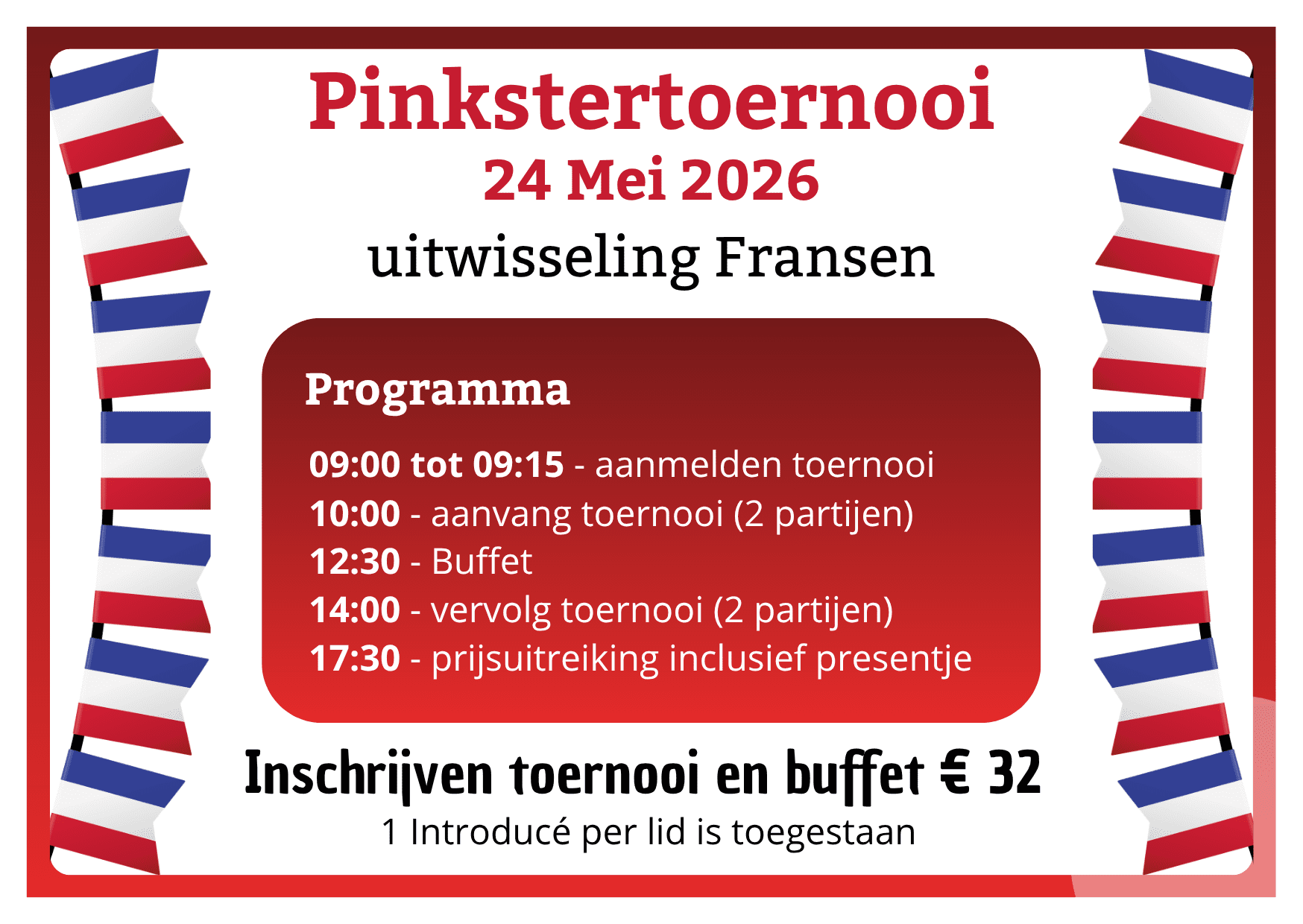 We verwachten dit jaar ongeveer 35 Fransen. In het toernooi zal iedere Franse speler zo veel mogelijk gekoppeld worden aan een Nederlander. Aan het einde van het toernooi ontvangt iedereen nog een leuk presentje. We wensen alvast alle deelnemers een leuk toernooi. Bij dit toernooi staat gezelligheid boven de prestatie.